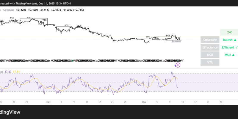 The ADA/USD 4-hour chart is bullish and efficient, with an MSU (Market Shift) structure formed on this timeframe. The technical indicators remain bearish but could soon switch bullish as ADA holds the $0.40 support level.