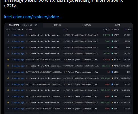 - A large-scale investor has offloaded millions of ASTER tokens, absorbing a 22% loss within two weeks.