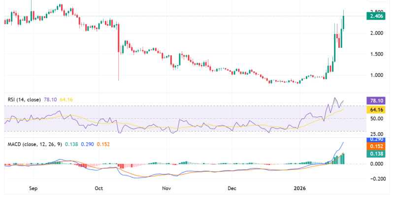 Today, in just 24 hours, the token rose by 19%, with its price currently at $2.406. This surge represents a strong rebound from the $1.06 low recorded earlier this week.