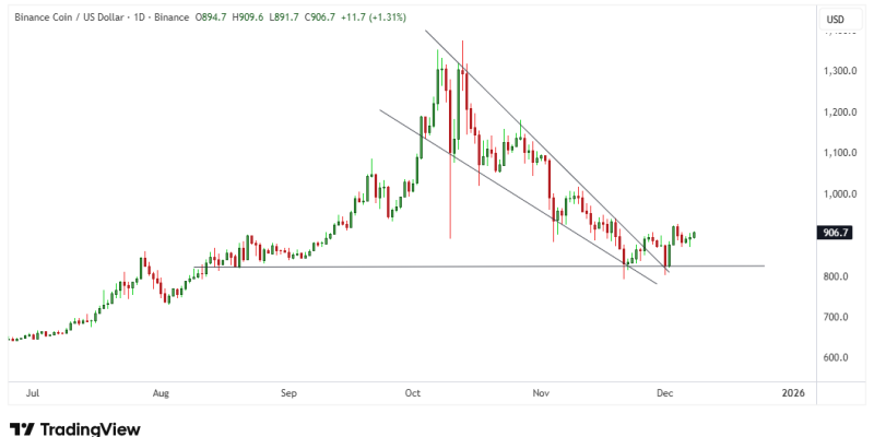On December 8, 2025, BNB traded to highs of $910, up nearly 2% as bulls pushed from lows of $872.