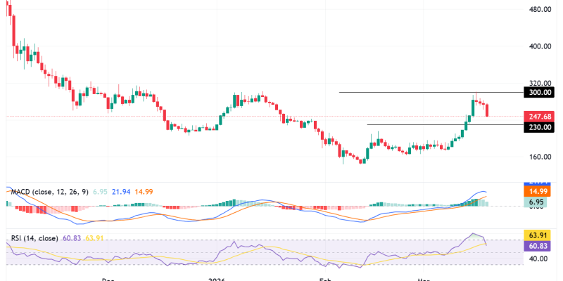 The upper boundary sits near the $282 to $300 zone, where multiple attempts to break higher have failed.