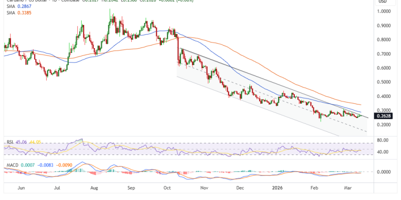 Cardano’s ADA remains under pressure as buyers struggle to regain momentum, with the token retreating from a key technical resistance level near $0.26.