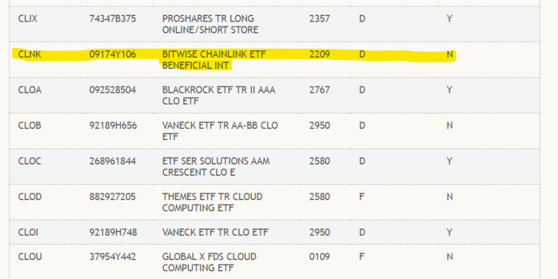 Bitwise’s Chainlink ETF has appeared on the DTCC’s eligibility list under the ticker CLNK, placing it in both the “active” and “pre-launch” categories.