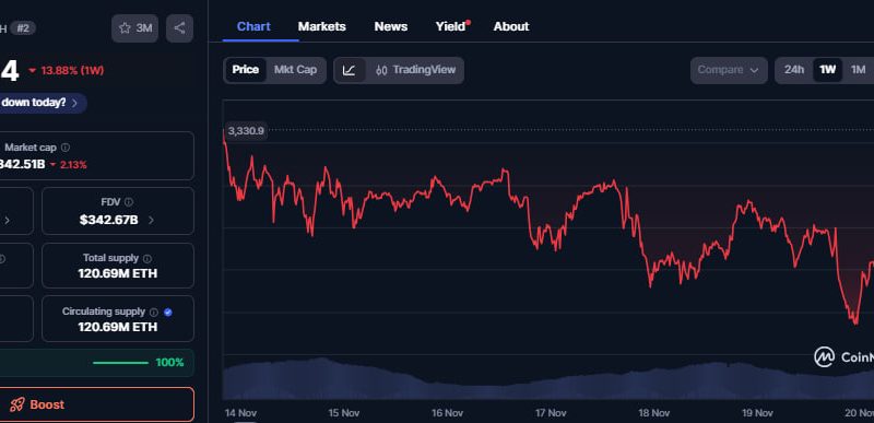 It is trading at $2,837 after losing more than 3% and 13% the past day and week.