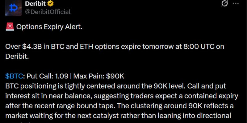 BTC positioning is tightly centered around the $90K level. Call and put interest sit in near balance, suggesting traders expect a contained expiry after the recent range-bound tape.