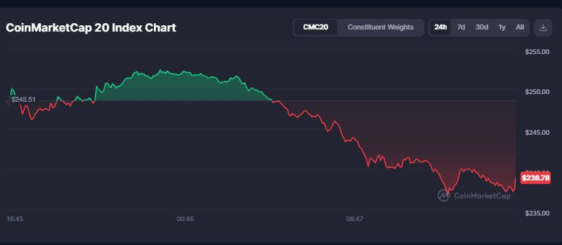 The CMC20 Index, which tracks the performance of the top twenty cryptocurrencies excluding wrapped versions and stablecoins, dipped by 5.95% in the past 24 hours.