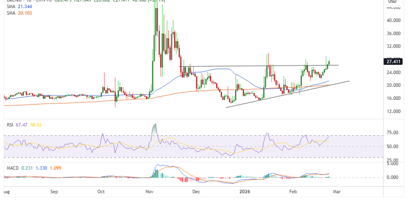 Decred (DCR) bulls are digging in as price hovers above the critical $25 support level, having jumped to intraday highs of $28 on February 24, 2026.