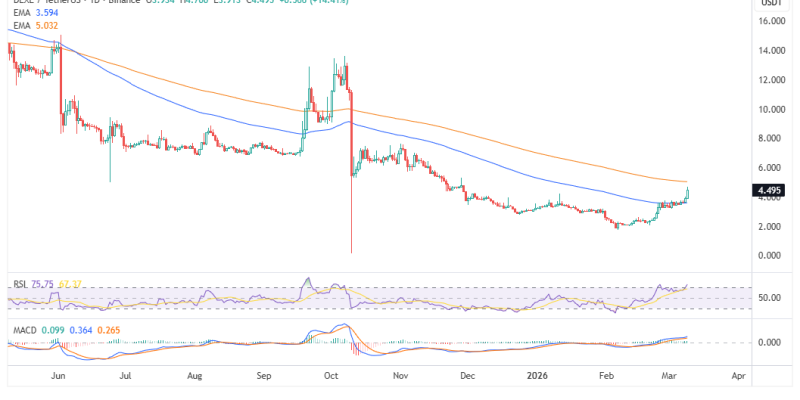 DeXe is trading above $4.70 at press time on Monday, March 9, 2026, extending intraday gains to over 22%.
