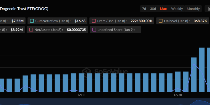 According to data from SoSoValue, Grayscale’s Dogecoin Trust ETF (GDOG) recorded a $7.55 million inflow on January 8, marking its largest single-day purchase since launch.