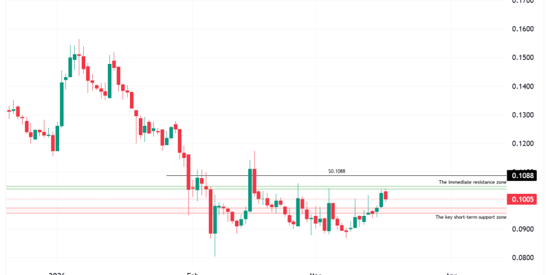 A breakdown below this level would weaken the current bullish outlook and increase the chances of a deeper move toward $0.094 or even $0.092.