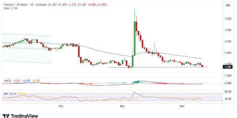 - Filecoin price fell 7% to under $1.40 on Thursday to put bulls under pressure.