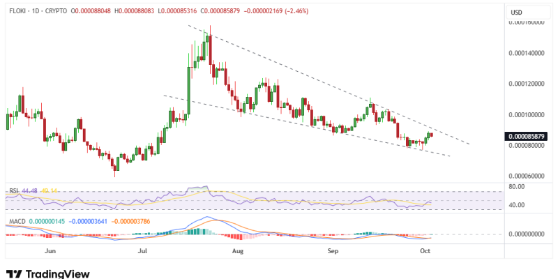 Floki (FLOKI) rose slightly on Friday, hitting intraday highs of $0.000088.