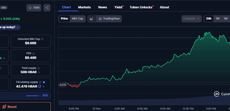 Hedera’s native token trades at $0.1896 after gaining more than 9% the past 24 hours.