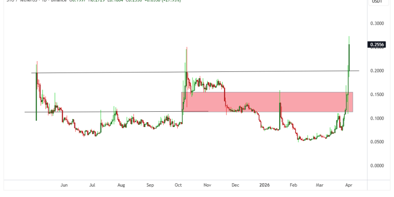 The price of $STO surged from $0.11 to $0.26 today, a 136% increase.