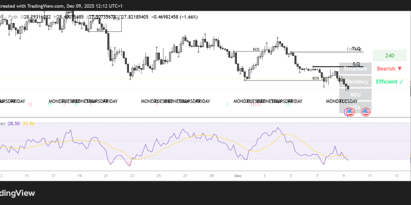 The HYPE/USD 4-hour chart is bearish and efficient as Hyperliquid has lost 8% of its value in the last 24 hours. The coin is currently trading below $28, breaking the support around $29.37.