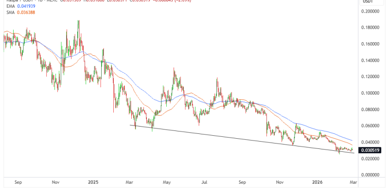 On the upside, immediate hurdles are at the 50-day and 100-day SMAs near $0.036 and $0.041.