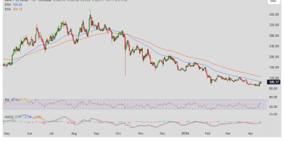 On the upside, immediate hurdles are at the 50-day and 100-day SMAs near $0.036 and $0.041.