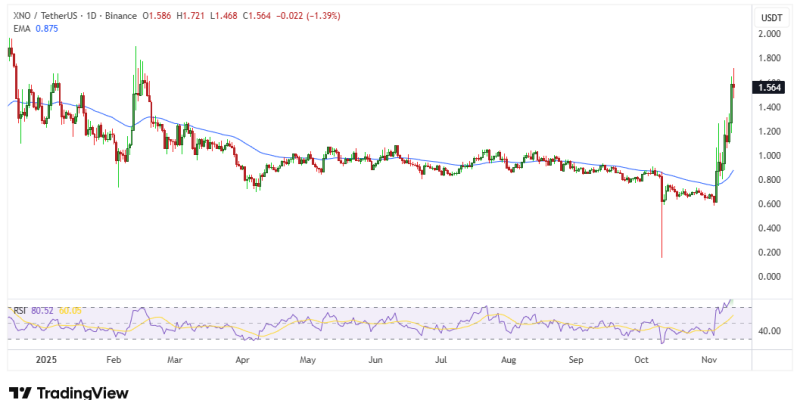 Nano (XNO) price soared to $1.72 in early trading on Wednesday, November 12, 2025, with a notable 32% increase over the past 24 hours, putting XNO among the biggest gainers.