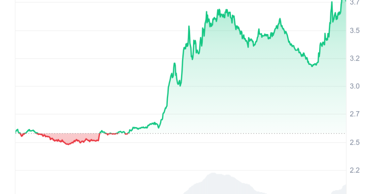 CAKE extended its rally on Monday, climbing 14% in the past 24 hours to reach $3.90 — its highest level since December 2024.