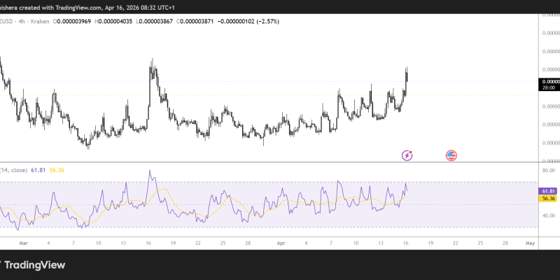 PEPE is now trading at $0.000003877, testing the 100-day EMA at $0.00000411, with no clear directional bias.