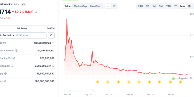 Pi Coin’s market performance over the past year has been unforgiving. After peaking near $3 shortly after trading began, the token has lost most of its value.