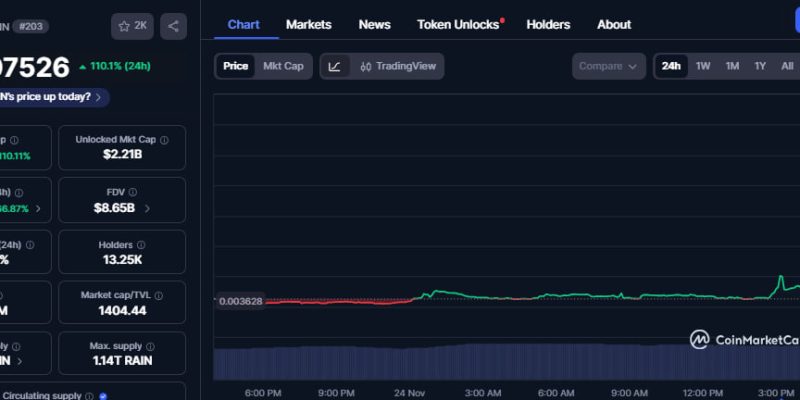 The altcoin has gained roughly 110% minutes after news that biopharmaceutical firm Enlivex Therapeutics plans to build a $212 million Rain-based crypto treasury.