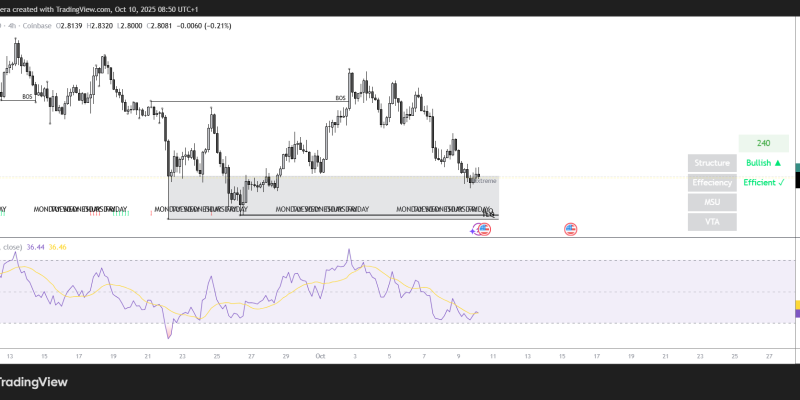 The XRP/USD 4-hour chart is bullish and efficient despite XRP losing 7% of its value this week. Its price faced rejection from the upper trendline boundary since last week and has lost 8% of its value by Thursday. The poor performance saw XRP close below the 100-day Exponential Moving Average (EMA) at $2.85. At press time, XRP is trading at $2.808 per coin.