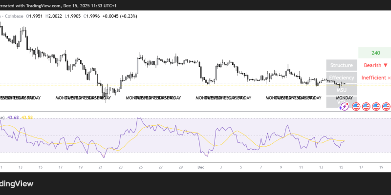 The XRP/USD 4-hour chart is bearish and inefficient, with the inefficiency caused by the October 11 deleveraging event. Since then, XRP has failed to rally to the $2.7 level to gain efficiency.