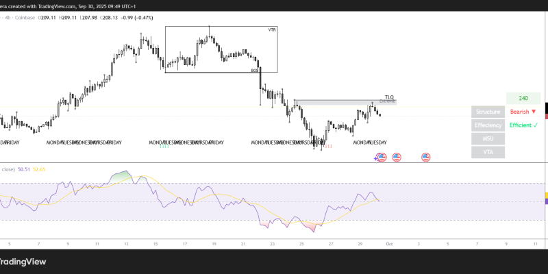 The SOL/USD 4-hour chart remains bearish and efficient as SOL failed to hit $220. The technical indicators on the 4-hour timeframe remain bullish despite the strong resistance.