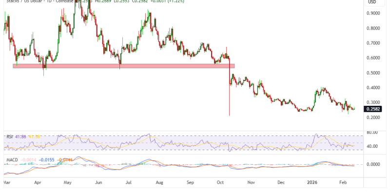 STX posted modest daily gains on February 12, 2026, trading around $0.27 at the time of writing with a 5% uptick.
