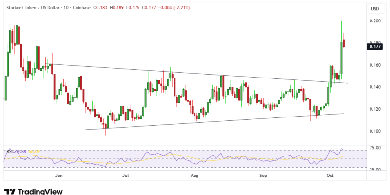 Starknet’s STRK token led altcoin performers, rocketing 20% in the last 24 hours to reach $0.1964.