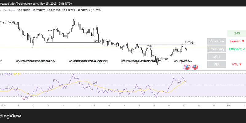 Currently, XLM is trading at $0.248, close to the 38.20% Fibonacci retracement level of  $0.256, a key resistance zone.