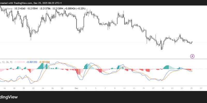 The RSI on the 4-hour chart reads 43, below the neutral 50 level, indicating bearish momentum is gaining traction. The Moving Average Convergence Divergence (MACD) lines are also converging, indicating indecision among traders.