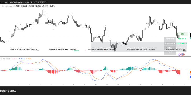 If the bearish trend continues, XRP could dip towards the $2.71 support over the next few hours. The Relative Strength Index (RSI) of 44 means that sellers are currently in control, with the MACD lines also dropping into the negative territory.