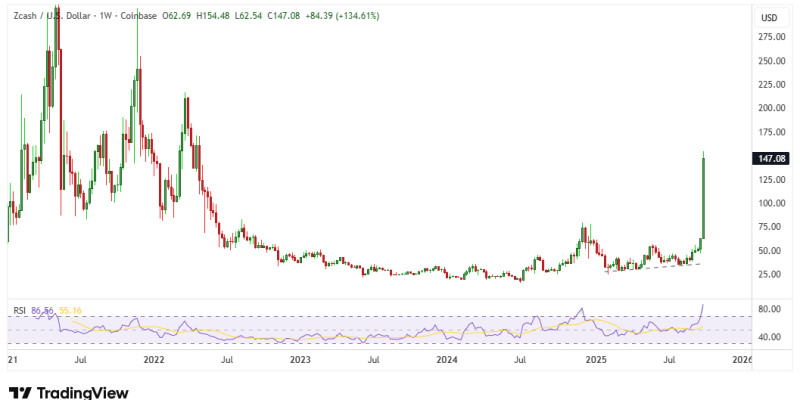 The weekly chart shows that ZEC could eye the $160 threshold, a level it failed to clear in April 2022.